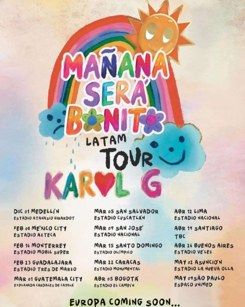 La cantante colombiana Karol G anunció que ofrecerá un concierto en la ciudad de Caracas, Venezuela, como parte de su tour Mañana Será Bonito. La artista también confirmó otras fechas de conciertos en Latinoamérica.